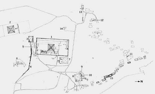 À une trentaine de kilomètres au sud du Caire, sur le bord de la falaise libyque, au nord de l’ancienne capitale de Memphis, s’étend l’une des plus vastes nécropoles d’Égypte, à laquelle on donne le nom du village actuel de Saqqara. De l’époque thinite datent d’importants mastabas en brique crue, dont certains furent peut-être des tombeaux royaux. Sous la IIIe dynastie (env. 2700), Imhotep, architecte du pharaon Djéser, y érigea le premier complexe funéraire royal totalement construit en pierre de taille, en assises réglées ; dans cet ensemble se trouvent résumés tous les éléments que la préhistoire et l’époque thinite avaient réalisés en matériaux plus légers. Plusieurs tâtonnements furent nécessaires avant la création de la pyramide à degrés, étape intermédiaire entre le mastaba et la pyramide parfaite, jalon décisif vers l’extraordinaire réussite que seront plus tard les pyramides de Dachour et de Giza. Le complexe funéraire de Djéser était entouré par un haut mur d’enceinte à redans en pierre calcaire blanche qui a été partiellement reconstitué. Il était dominé par la masse de la pyramide à six degrés, sorte d’escalier monumental qui permettait aux dieux de descendre sur la terre et à l’âme du défunt de monter vers le ciel. Au-dessous, le dédale des appartements souterrains aboutissait au caveau construit en granite ; dans deux galeries servant de magasins ont été retrouvés, entassés par milliers, des vases et des récipients d’albâtre et de schiste datant des deux premières dynasties. Djéser s’était fait construire un deuxième tombeau, pratiqué dans l’épaisseur du mur d’enceinte sud ; son emplacement était marqué par une sorte de mastaba qui faisait saillie sur le sommet du mur. Les deux appartements funéraires rappelaient sans doute que Djéser était roi à la fois de Haute-Égypte et de Basse-Égypte, dualité que l’on retrouve tout au long de l’histoire pharaonique. Un certain nombre d’édifices factices évoquaient les rites spécifiques du pouvoir monarchique ; c’est le cas, par exemple, des belles façades des chapelles de la cour de la fête-sed , remontées par les soins de J.-P. Lauer, qui ne masquent que des remblais. Cet hallucinant ensemble était un pur simulacre destiné au seul usage de l’âme du roi.