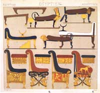L’Egypte qui a toujours été pauvre en bois, devait importer de Nubie et du Liban, les essences nobles qui ne poussaient pas sur son sol. Ses artisans étaient de véritables artistes, capables d’incruster les meubles d’ivoire ou de pâte de verre ou de les plaquer d’or ou d’argent en feuille mince. Ils privilégiaient les motifs floraux ou animaux pour la décoration : scènes de chasse, pieds de lion, lotus, papyrus ou oiseaux ?
