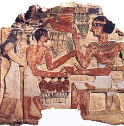 L’archéologue anglais W.B. Emery fit ainsi une découverte remarquable sur le site de Saqqarah en 1939. En explorant une tombe inviolée de la IIe dynastie, vieille d’environ 4700 ans, il tomba sur un festin réel servi dans de la vaisselle de terre cuite. Il y avait la du pain, un ragoût de pigeon, des plats de poisson, une caille rôtie, des côtelettes de porc et de jarret, de la compote de figues, des gâteaux au miel et une jarre de vin.