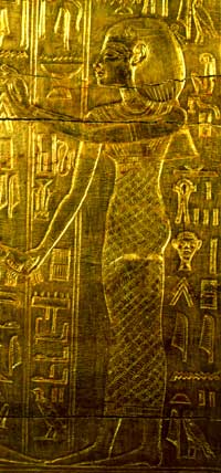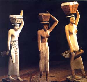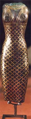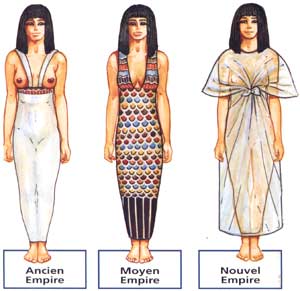 La tenue typique de la femme égyptienne était composé d’une longue robe-fourreau moulante en lin tissé retenue par des bretelles et s’arrêtant sous les seins, les laissant découvert. Les déesses ont ainsi été représentée pendant près de 3 000 ans. Ce vêtement mettait en valeur les formes des femmes, qui portaient parfois par dessus, une tunique transparente à manche longue. Au Moyen Empire, certaines rajoutaient une résille à motifs par dessus cette tunique. On peut à ce sujet voir au Louvre, une statuette en bois représentant une porteuse d’auge vêtue d’une robe moulante décorée d’une résille dont le motif polychrome imite le plumage d’un oiseau.