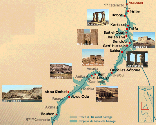 L’un des témoignages les plus éclatants de la grandeur de la civilisation égyptienne consistait, jusqu’à ces toutes récentes décennies, dans la présence en Nubie, tout au long de la vallée du Nil, de grands temples pharaoniques. La construction du haut barrage d’Assouan (Sadd al-‘Ali) en a submergé l’emplacement sous les flots de l’immense lac Nasser. Au prix d’efforts gigantesques, les principaux monuments ont été démontés et reconstitués hors de la portée des eaux ; certains ont été donnés à des pays étrangers qui avaient participé à la campagne archéologique internationale menée à l’appel de l’U.N.E.S.C.O.