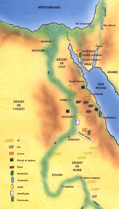 Dans le Sinaï, en Nubie et dans le désert arabique d’autres mines étaient consacrées à l’extraction du plomb, du cuivre, de la turquoise, de la galène argentifère, des aigues-marines, de la malachite et même des émeraudes.