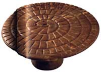 Il existe encore quelques exemplaires du support de ce jeu qui remontent à la première dynastie et dont les deux spécimens les mieux conservés se trouvent, l’un au Musée de Leyde, l’autre au Musée du Louvre. L’exemplaire parisien a été taillé dans un bloc de calcite. Il se présente sous la forme d’un plateau circulaire d’environ 0.60 m de diamètre, muni d’un pied évasé, constituant ainsi une sorte de petit guéridon bas.