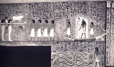 Dans les tombes de la Vallée des Rois, le voyage nocturne du soleil évoque ce dernier sur sa barque, protégé par les méandres du mehen qui entoure son image humaine à tête de bélier.