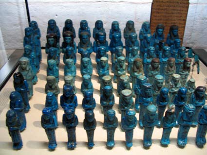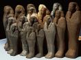 Les chaouabtis ou ouchebtis (en égyptien « répondants ») sont de petites figurines qui participent aux travaux agricoles de l’au-delà. En nombre restreint au Moyen Empire, à la fin du Nouvel Empire on peut trouver, sans que ce nombre soit toujours respecté, 365 sujets augmentés de 36 chefs et d’un scribe. Ils sont placés dans des coffrets de bois décorés. [...]. Ils sont fabriqués en pierre, en bois, exceptionnellement en bronze, et un nombre important en faïence égyptienne. Ils peuvent porter soit le nom du personnage qu’ils représentent, soit tout ou partie du chapitre VI du Livre des Morts.