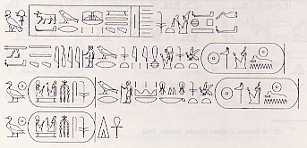 L’Horus [Hor] : Taureau puissant de Rê [Ka nékhèt n(y) Rê] qui met en pièce (brise) les Asiatiques [séd(ou) Séttyou]. Les deux Maîtresses [Nebty] : Qui combat pour la multitude, Lion au cœur fort [Âha(ou) n héhé, rou sékhèm-ib] . L’Horus d ’Or [Hor nébou] : Grand de victoires sur tout pays étrangers [ Our nékhétou Hèr Khasout nébout] ( les Pays asiatiques du nord, Amou ; les Pays désertiques , Temehou ; Bédouins ). Le Roi de Haute et de Basse Égypte [Nésout bity] : Puissante est la Justice de Rê [Ouser-Maât-Rê], Taureau sur sa frontière [Ka hèr tach=èf ], pour fondre sur tout pays [r âoun ta nb ] qui fuit devant lui [outèkh(ou) r-hat=èf ], sur ordre d ’Amon [hèr wdj Imèn], son noble père [it(=èf) chépès ]. Cela a été fait pour lui (litt. Ça a été fait par cela pour lui) [ir n n=èf]. Le fils de Rê [Sa Rê ] : Rê l’a engendré - l’Aimé d ’Amon [Ramsès-Mery Imèn], qu’il vive éternellement ! [Ankh(=èf) djet ! ]
