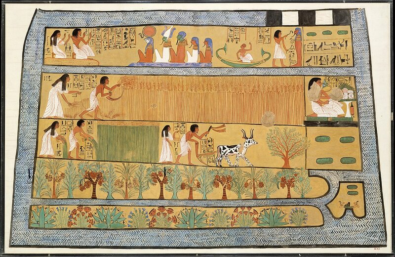 C’est au chapitre 110 du livre pour sortir le jour (le Livre des Morts) qu’apparaît le défunt dans les champs d’Ialou. La moisson y est foisonnante, le défunt peut apprécier les champs à perte de vue, et y « voir Rê, Osiris et Thot chaque jour [2] » ou recevoir des offrandes.